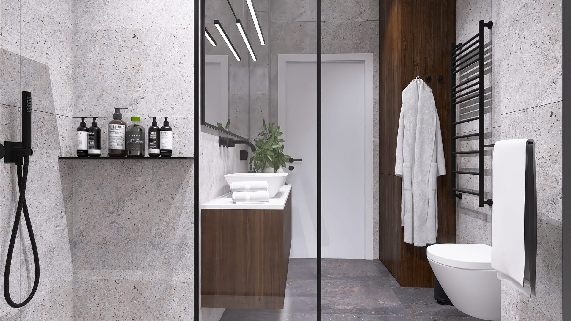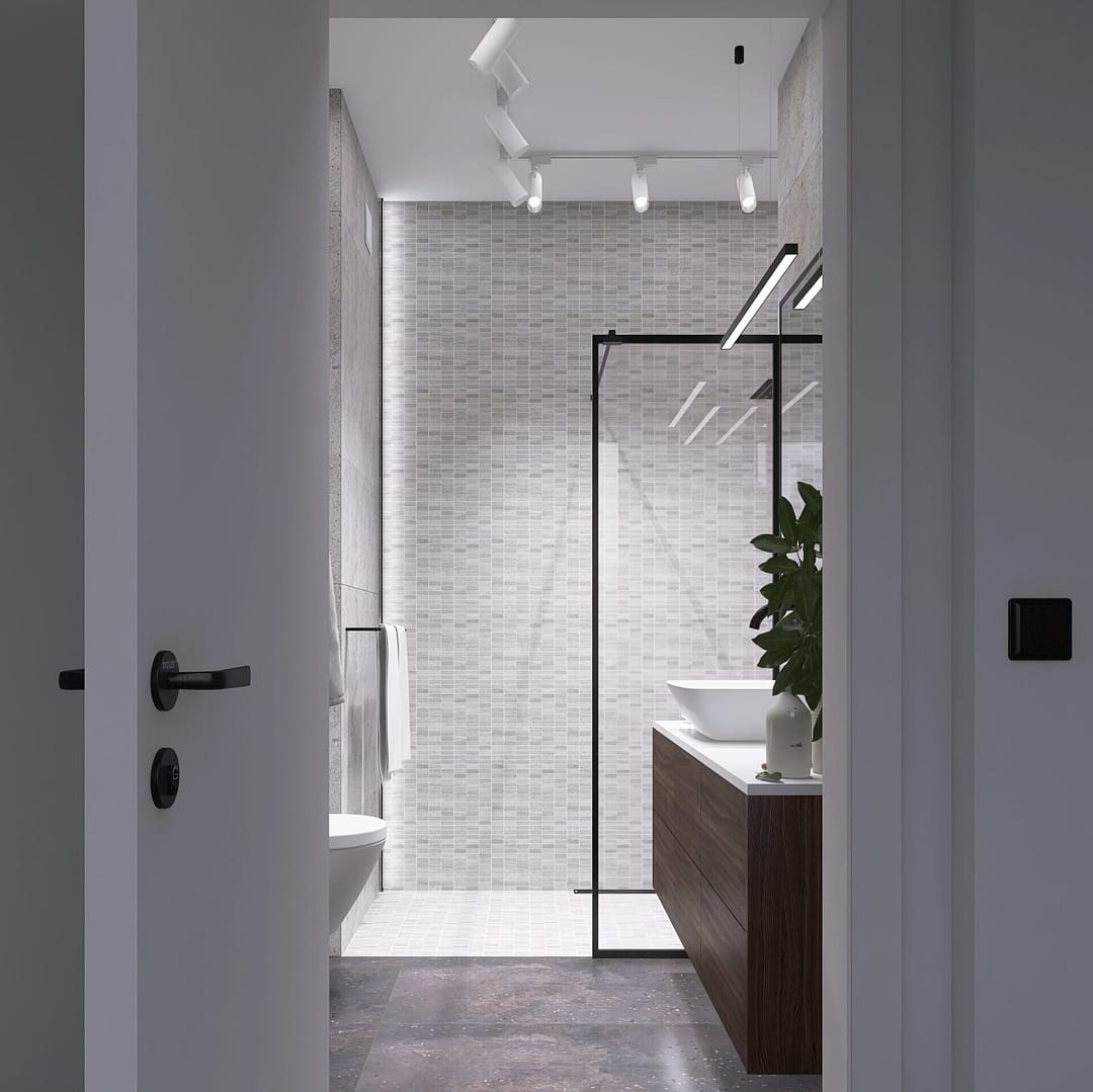 Łazienka również nazwana „łazienką niemożliwą” bo to właśnie jedna z tych łazienek gdzie na pozór nic się nie mieści. A jednak! Udało się wygospodarować miejsce nawet na prysznic typu walki-in. Zaproponowałam Inwestorom zmianę układu i przesunięcie ściany. Ta lekka przebudowa i kosmetyka otworu drzwiowego wyszła na ogromny plus dla tego wnętrza. Zyskaliśmy małą wnękę na prysznic i właśnie dzięki temu Inwestorzy otrzymali swój wymarzony prysznic walk-in.