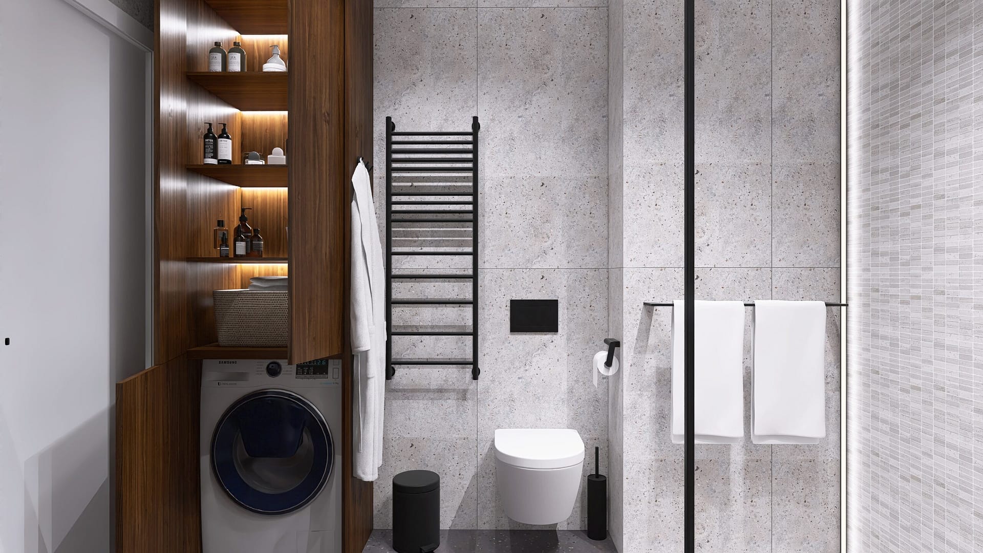 Zaraz koło drzwi wysoka zabudowa na pralkę, kosz na brudną bieliznę oraz całą niezbędną chemię i środki czystości.