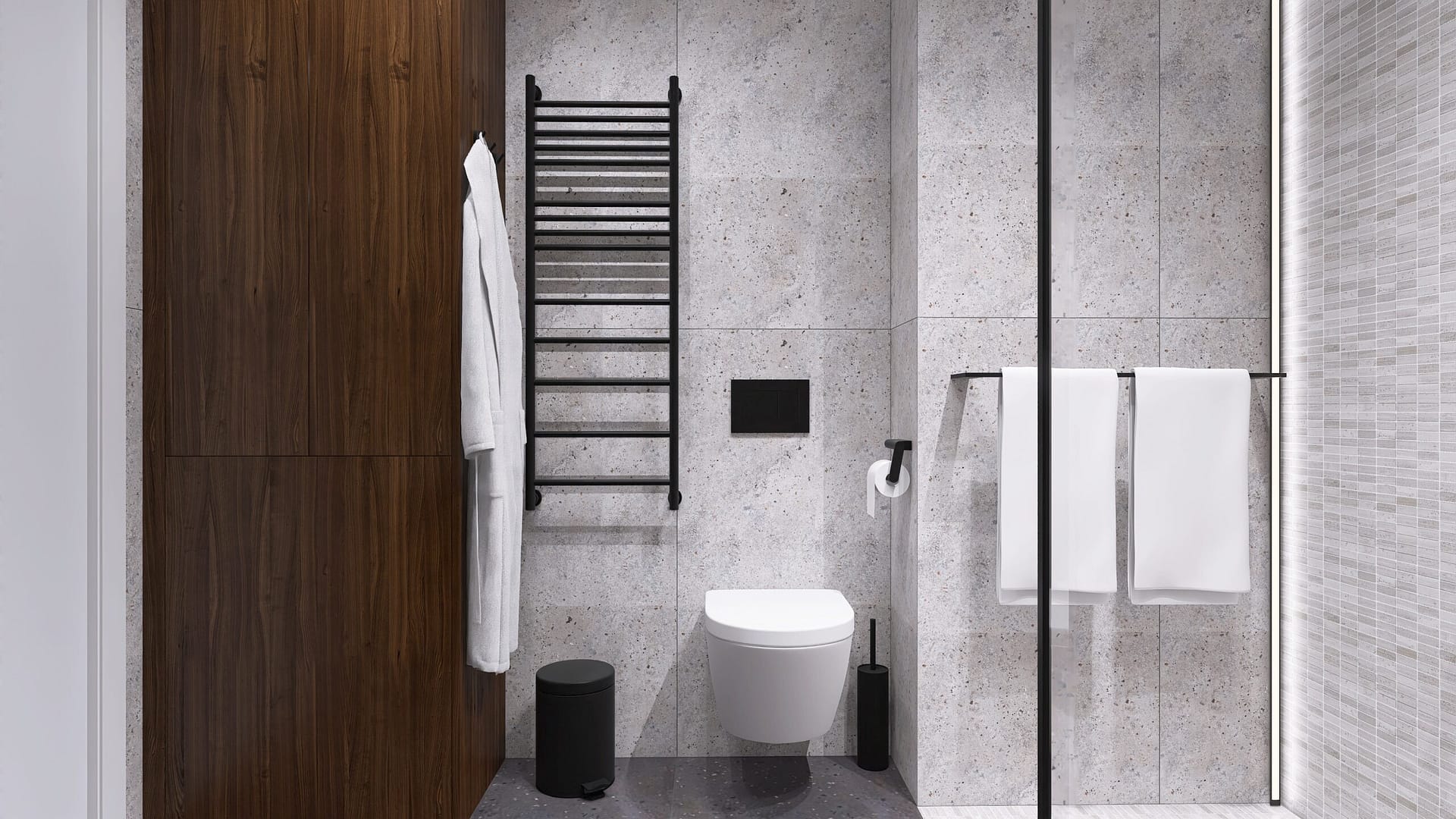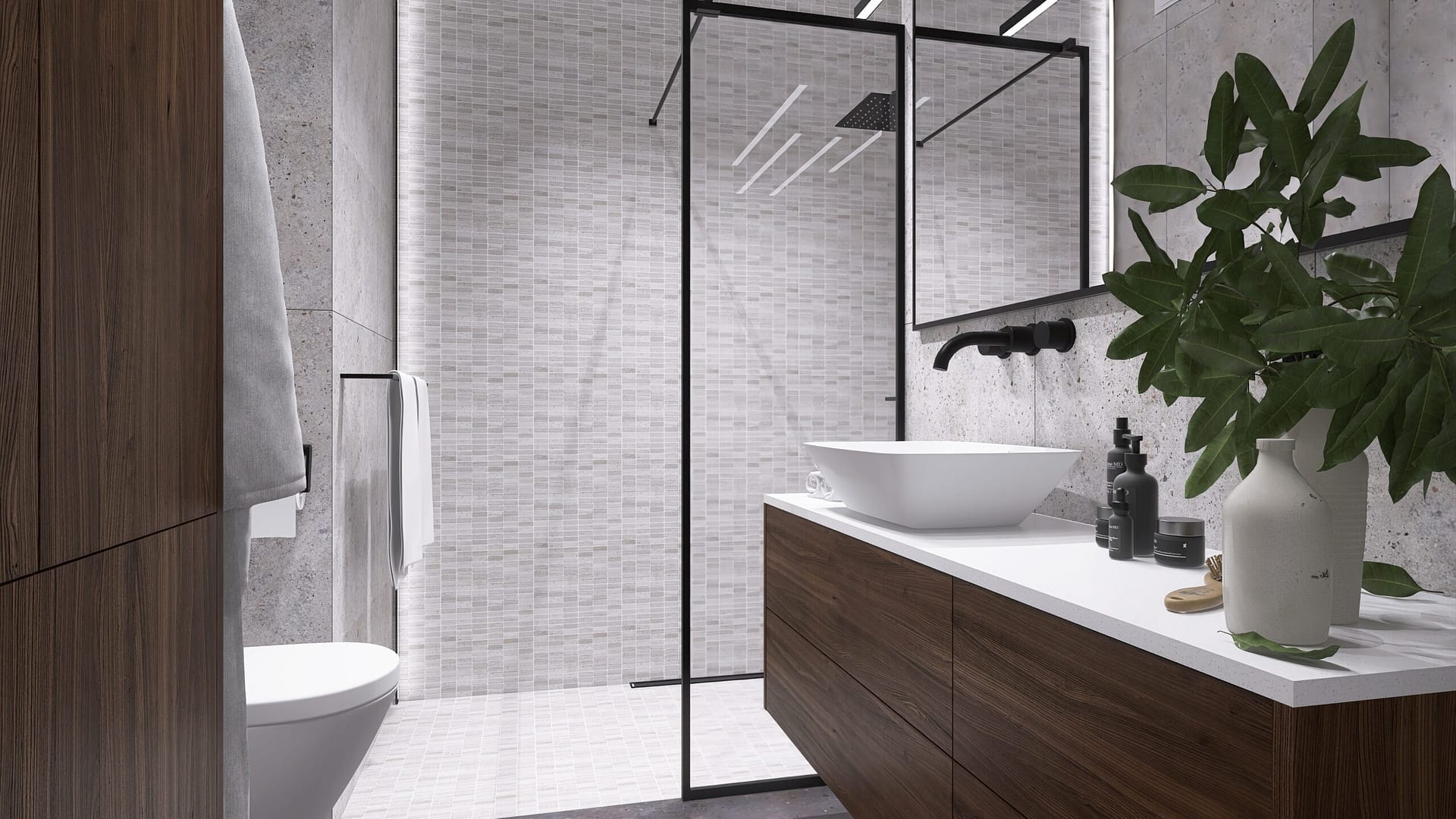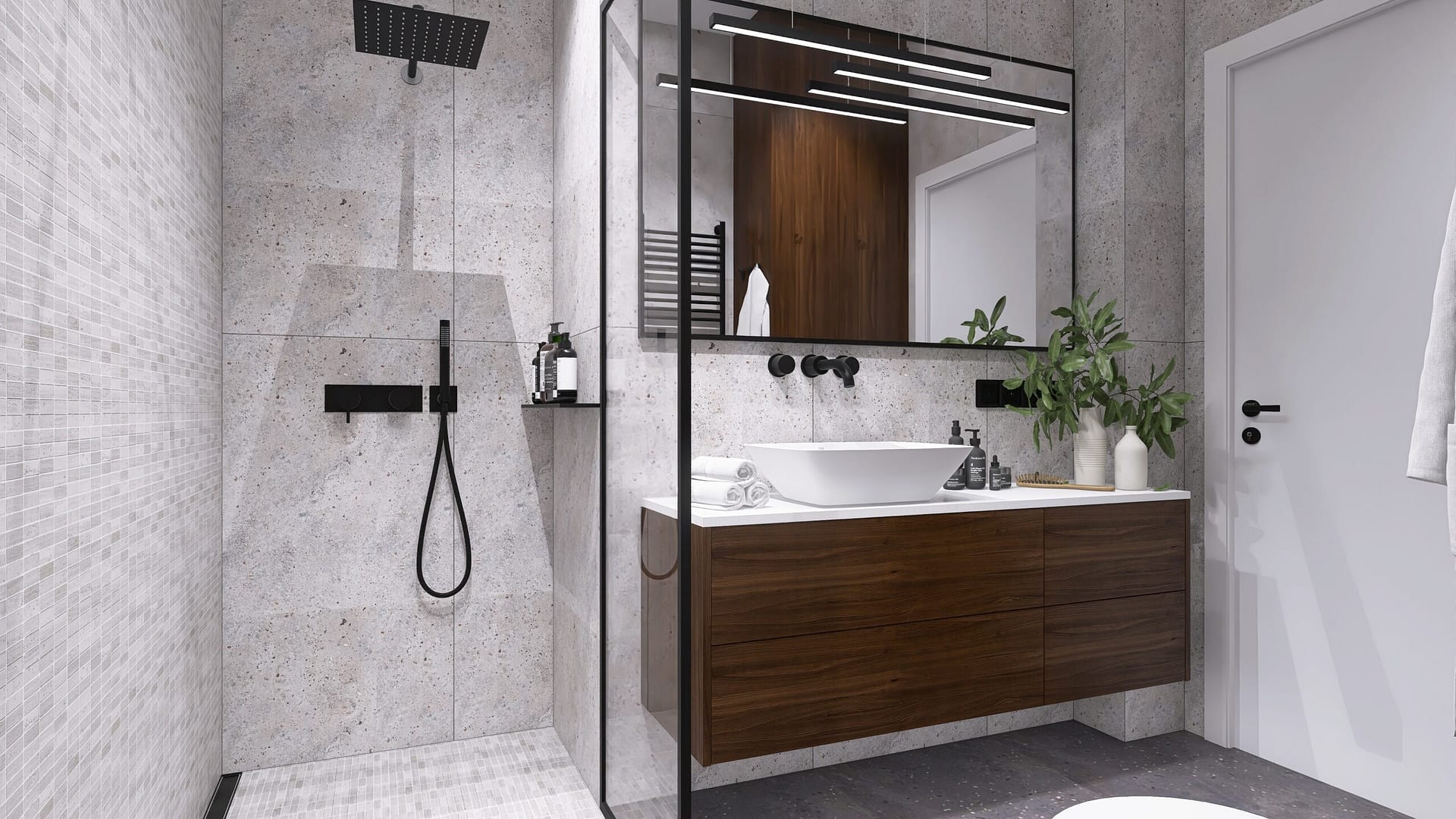 W łazience zaproponowałam płytki w kolorze betonu z motywem lastryko. Pod prysznicem na podłodze oraz ścianie mozaika również szarości – imitacja betonu.
