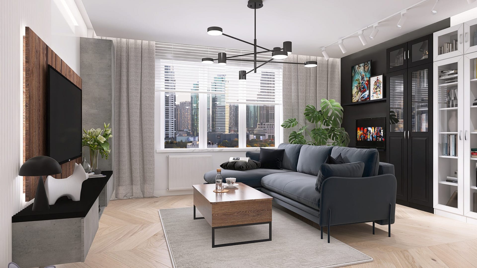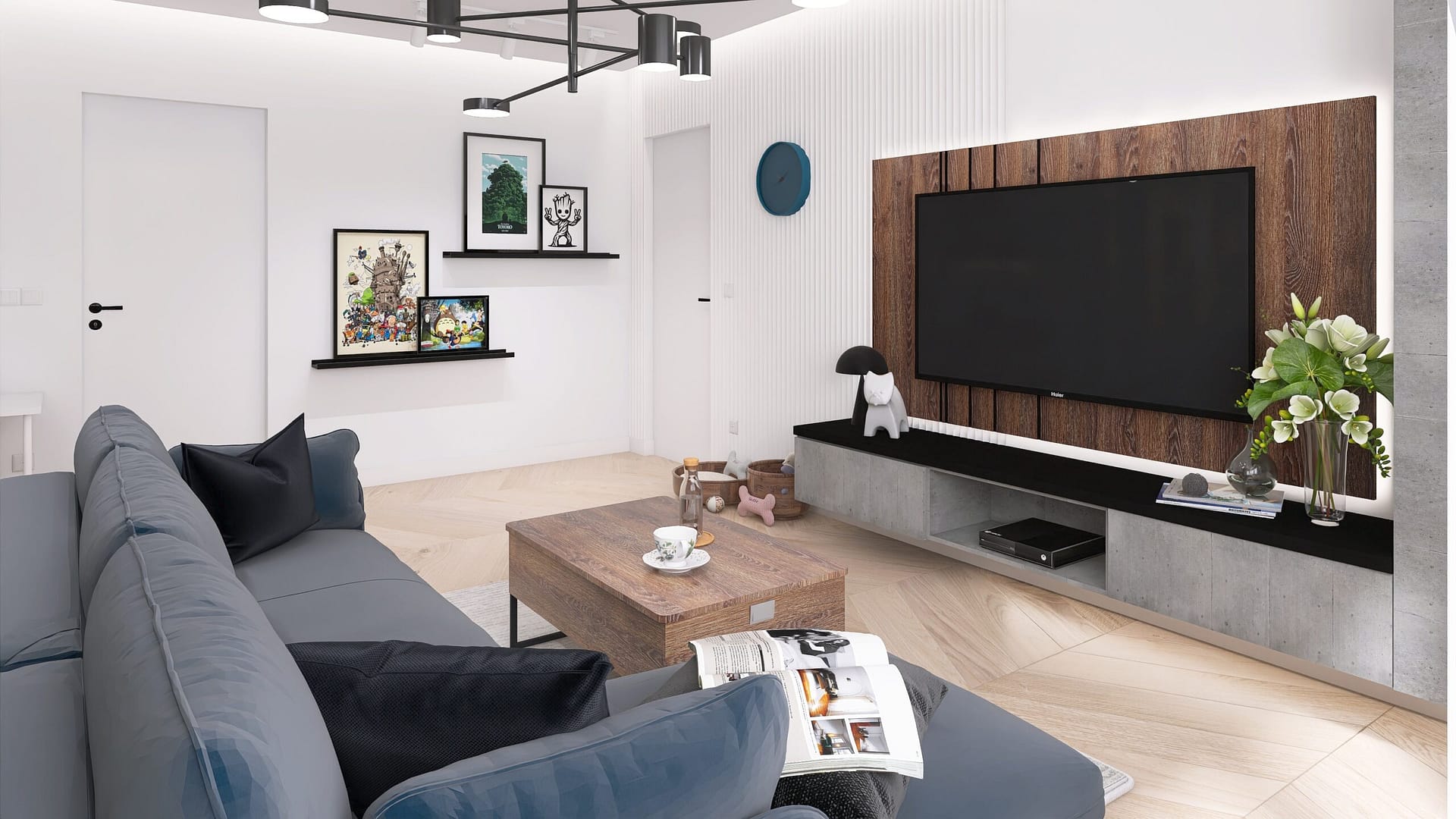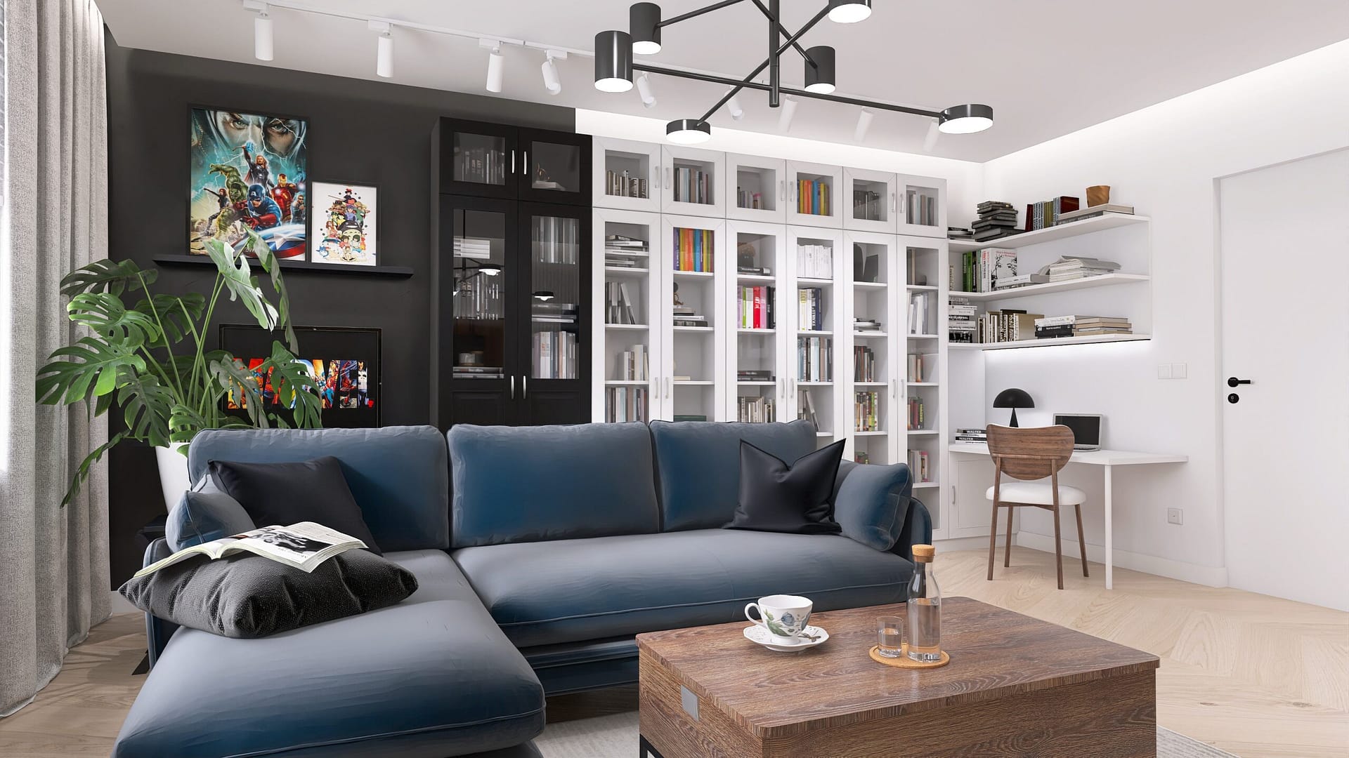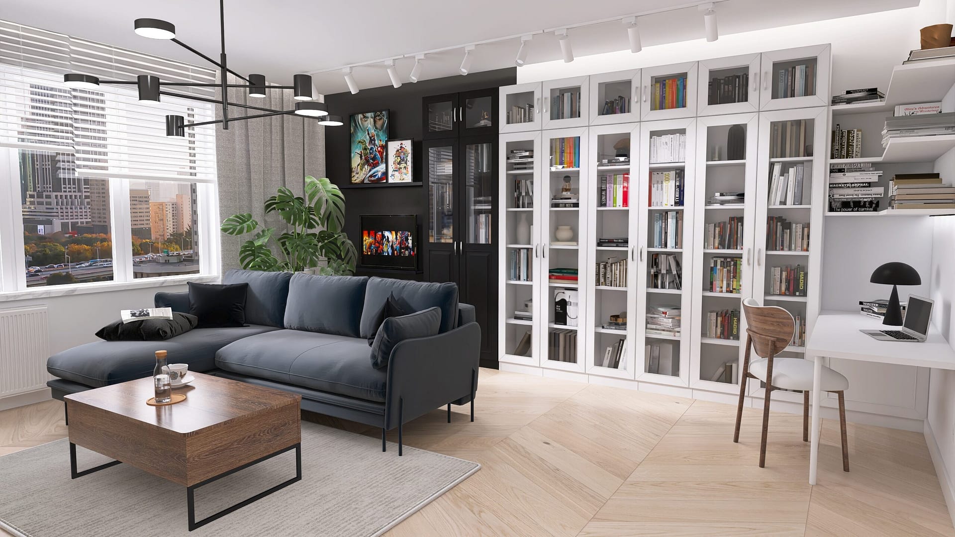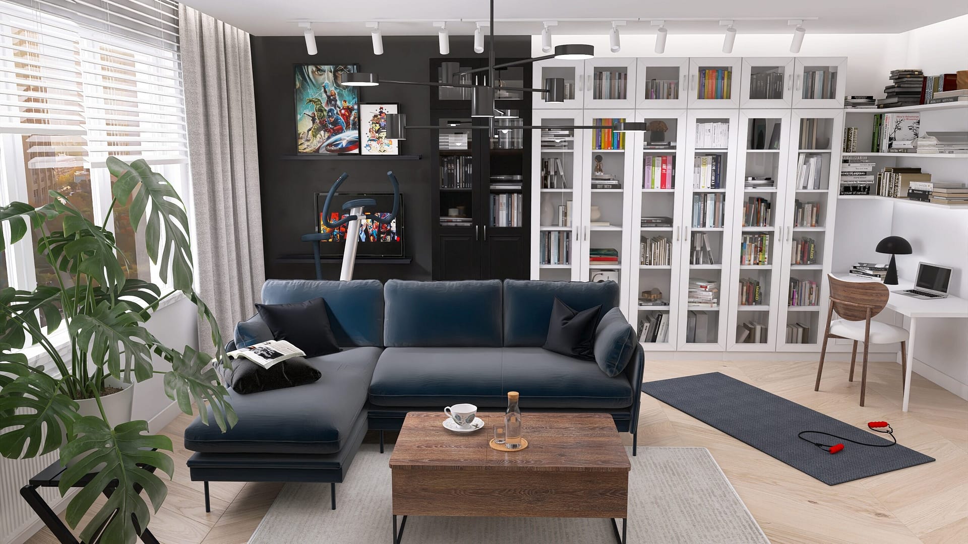 Projekt salonu w bloku tak zwany salon wielofunkcyjny. W dzisiejszych czasach w małych mieszkaniach przestrzeń salonu wykorzystuje się coraz częściej do prawie maksimum. I tu właśnie mamy taki przykład salonu będącym przestrzenią codziennego relaksu na kanapie przed telewizorem, przestrzenią do pracy zdalnej, do ćwiczeń oraz przechowywania – a dokładniej domowa biblioteką.