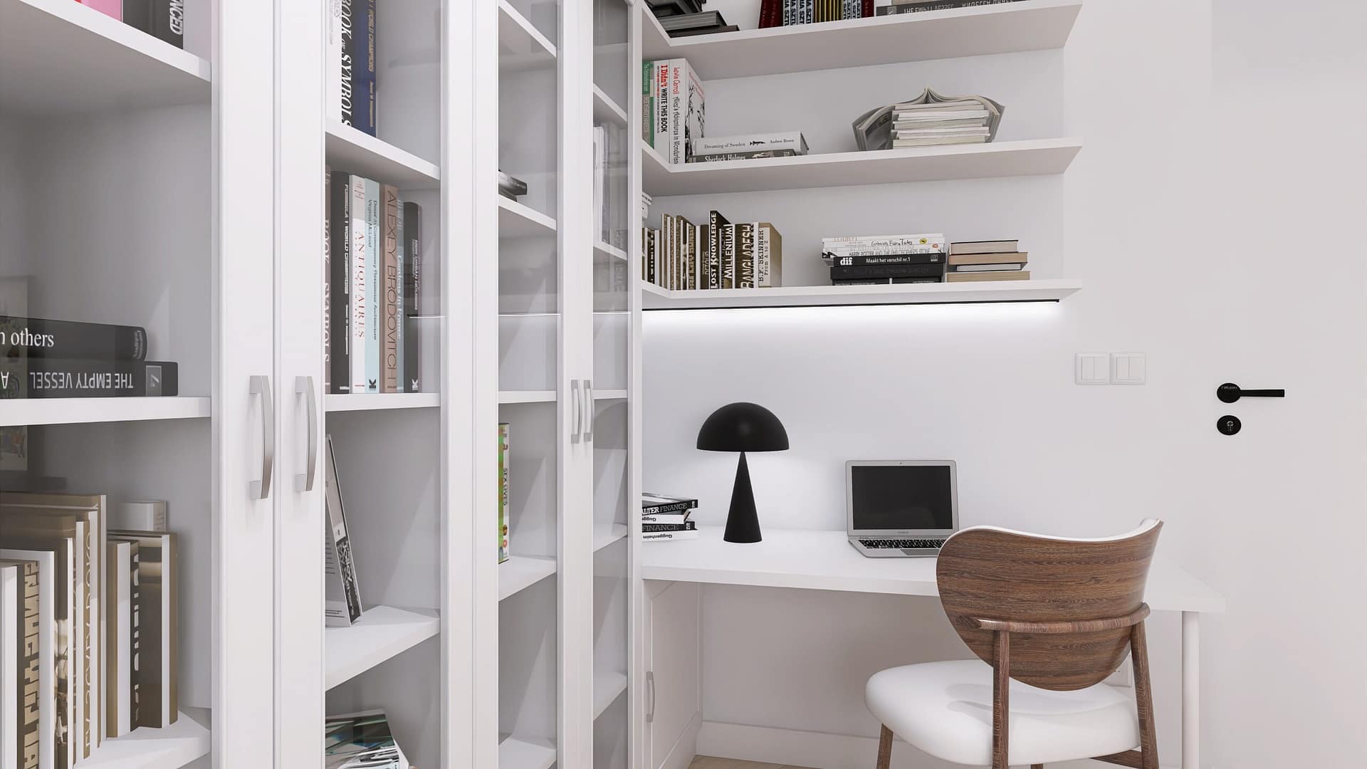 W projekcie wykorzystałam najdłuższą ścianę na przestrzeń do przechowywania dużej ilości książek, o którą prosili Inwestorzy. Zaproponowałam stworzenie ściany z książkami z czterech witryn IKEA w podwójnej kolorystyce. Nadało to lekkości i wizualnie skróciło długość zabudowy, jednocześnie wciąż pozwalając na posiadanie dużej ilości miejsca na ukochane lektury. Po prawej stronie znalazło się miejsce na biurko z nadbudową do pracy zdalnej. Całość utrzymana jest w białej zabudowie.