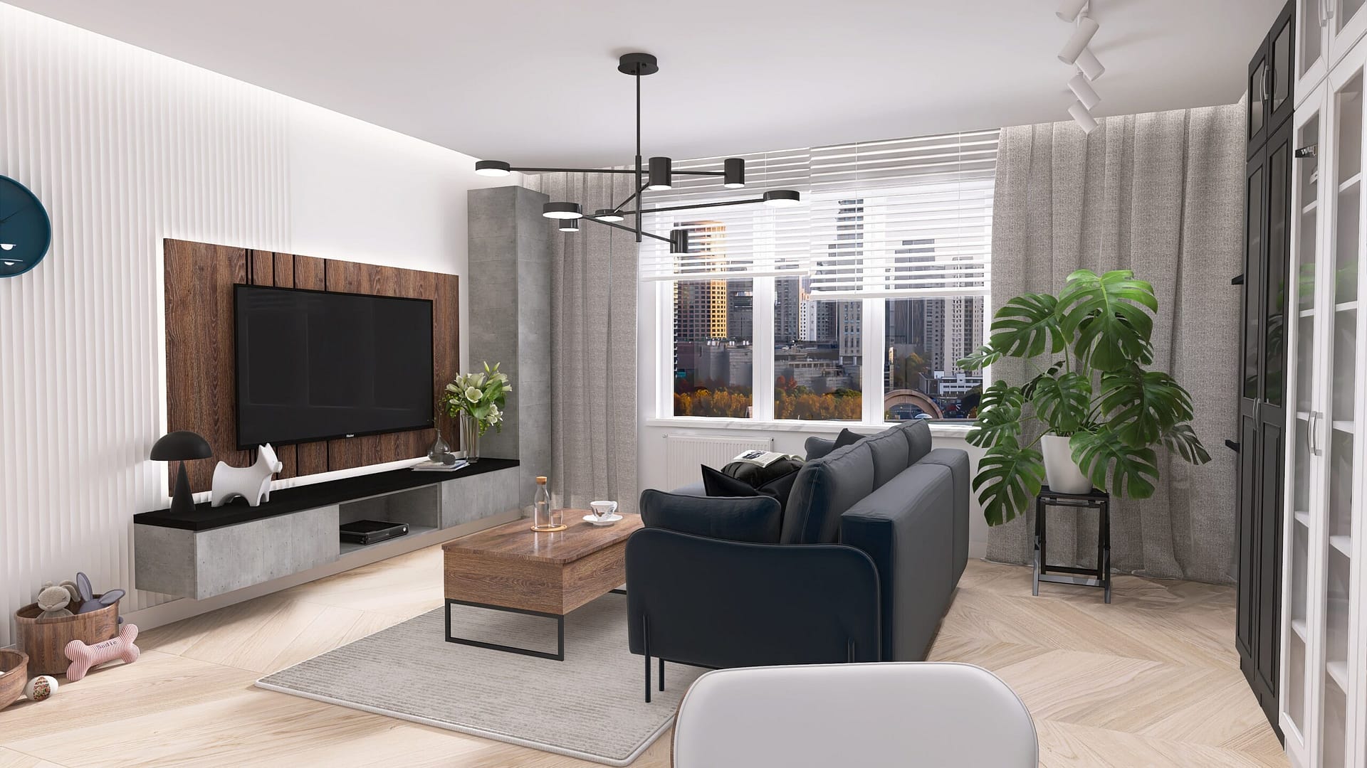 Zaproponowany układ został wnikliwie przemyślany, aby stworzyć nie tylko salon, ale również potrzebną przestrzeń wielozadaniową.