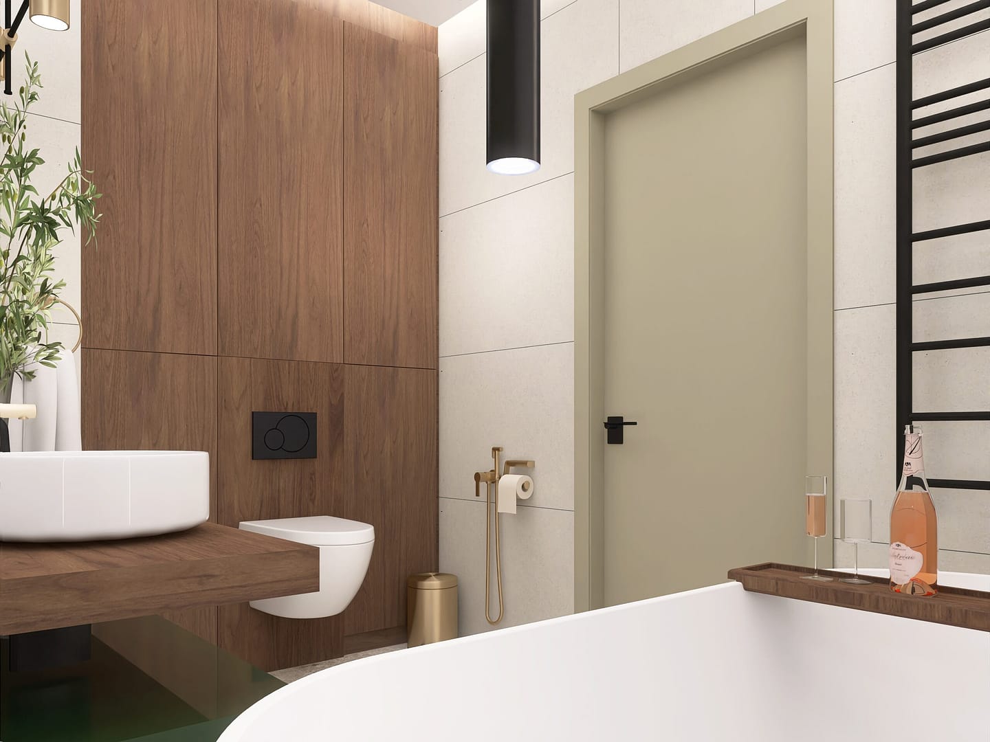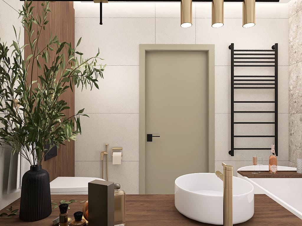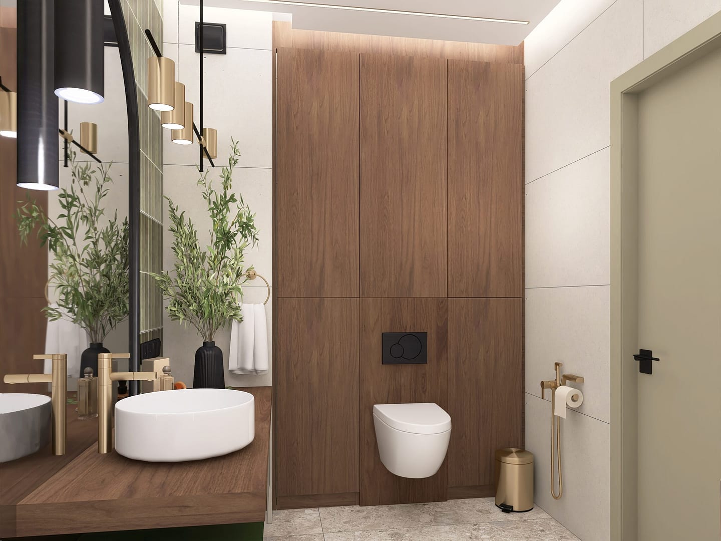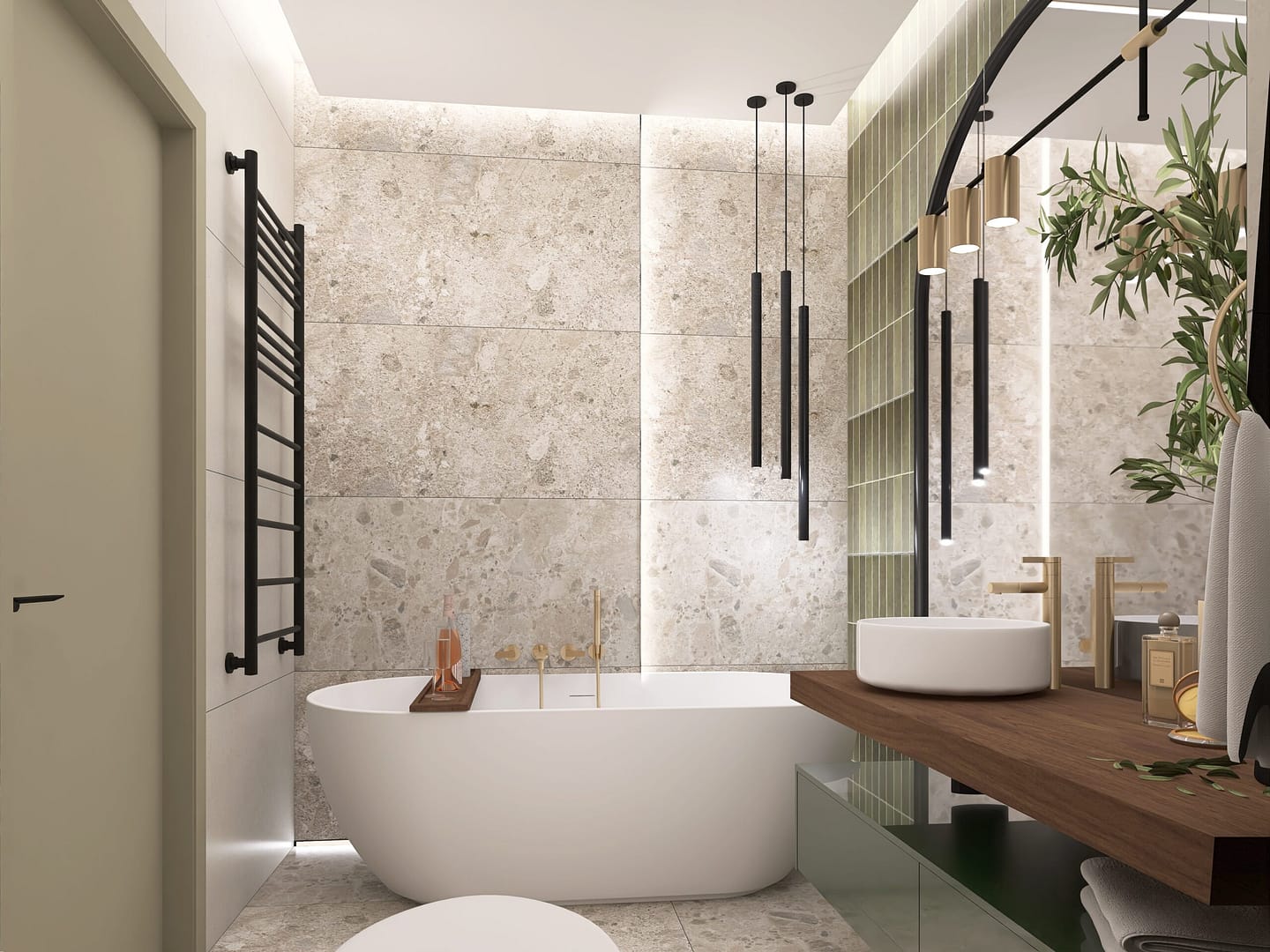 Łazienka również jest pomieszczeniem, które potrzebuje kilka rodzajów oświetlenia. Funkcyjne, dekoracyjne oraz nastrojowe i tak właśnie zaplanowałam to w tej łazience. Oświetlenie, za i nad wanną doda klimatu przy kąpieli z lampką wina. Przy wiszącej lampie domownicy swobodnie skorzystają z lustra, a ledy w zabudowie sufitu i ścian podkreślą użyte materiały i rozświetlą pomieszczenie.