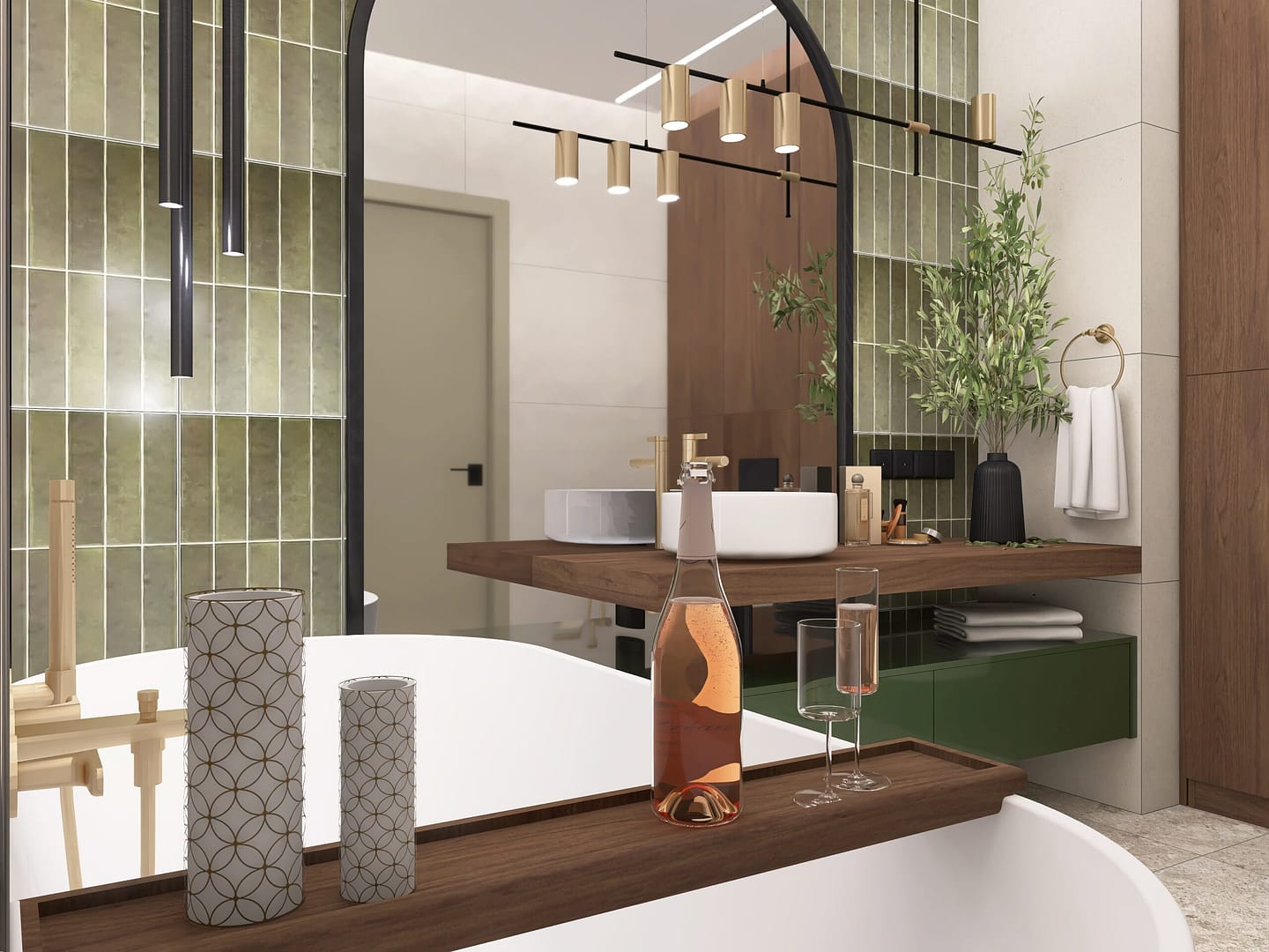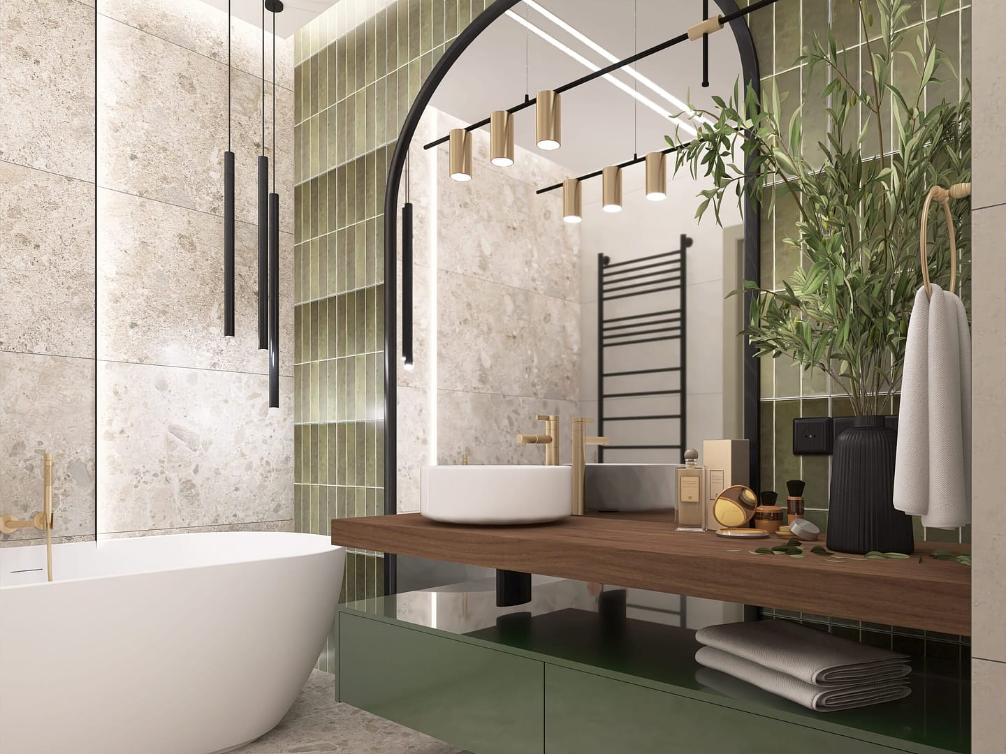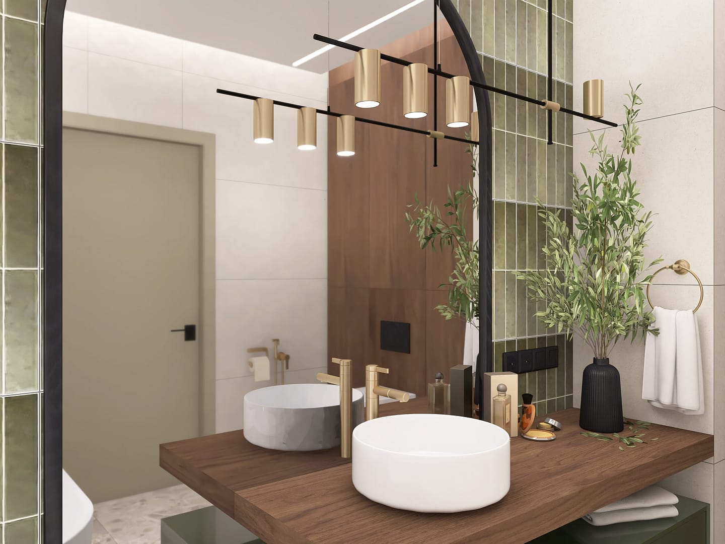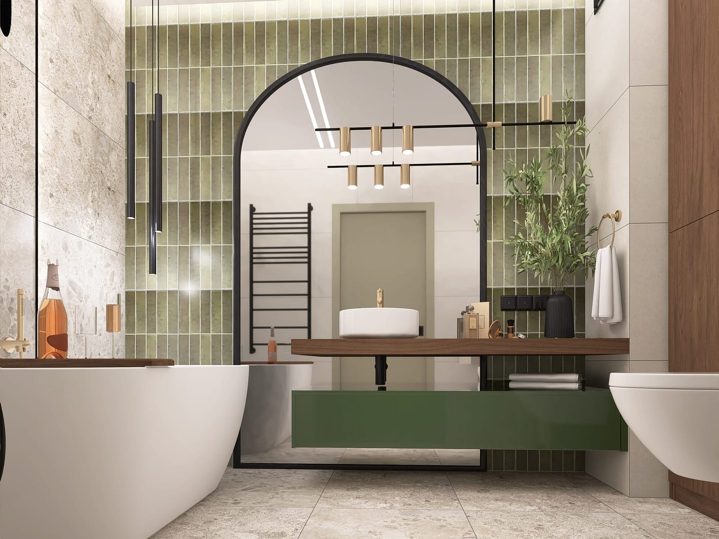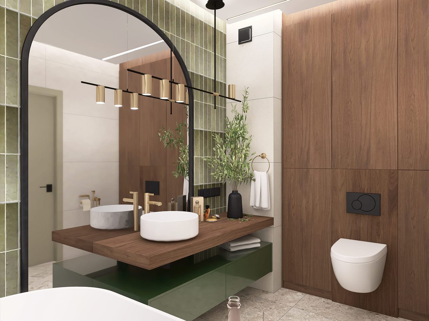 Układ łazienki prosty ale jak funkcjonalny. Na wprost po wejściu do pomieszczenie umywalka. Za umywalką piękne w prostej klasycznej ramie lustro ale jego kształt od razu przenosi nas w Śródziemnomorskie klimaty architektoniczne. Ścianę za zdobią klasyczne proste oliwkowe kafelki.