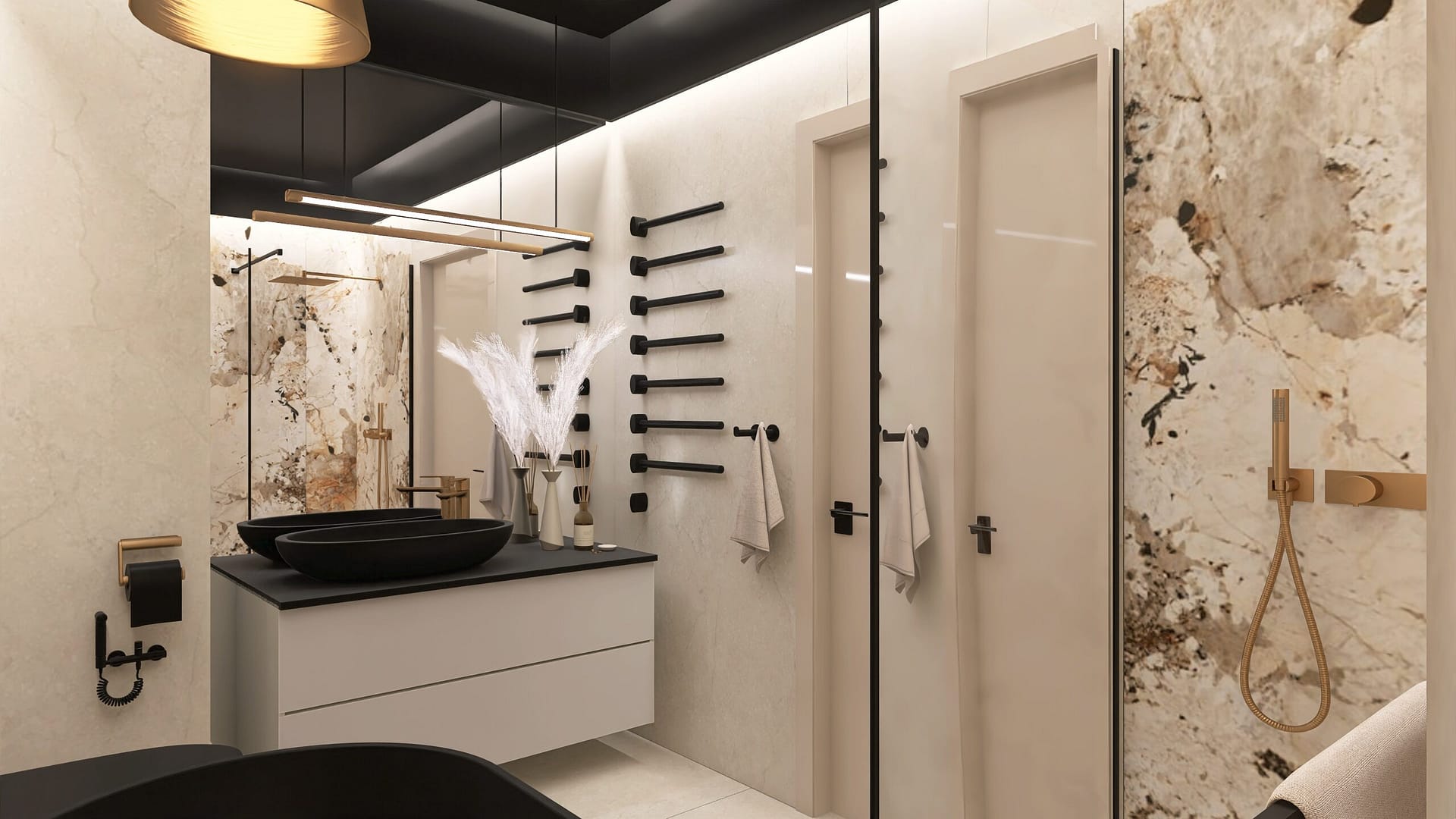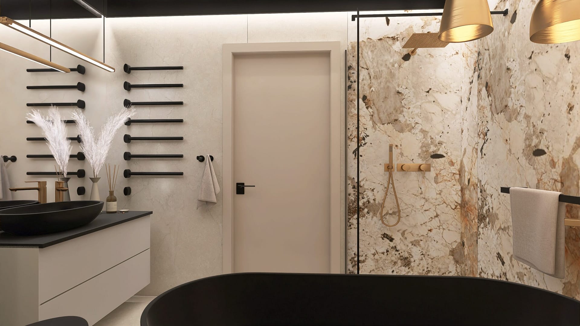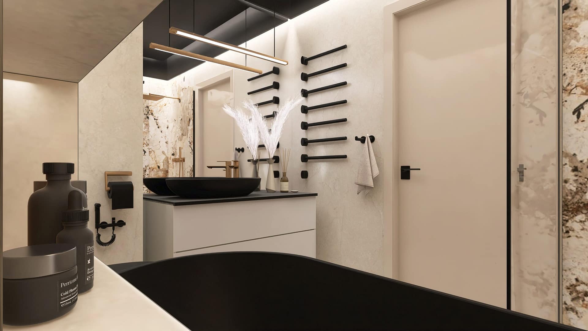Łazienka o powierzchni 5,5m2 – niewielka, a w zaproponowanym układzie udało się zmieścić i wannę i prysznic. Prysznic typu Walk-in oraz wanna wolnostojąca w kolorze czarny mat. Z tej samej serii produktów zaproponowałam również nablatową umywalkę.