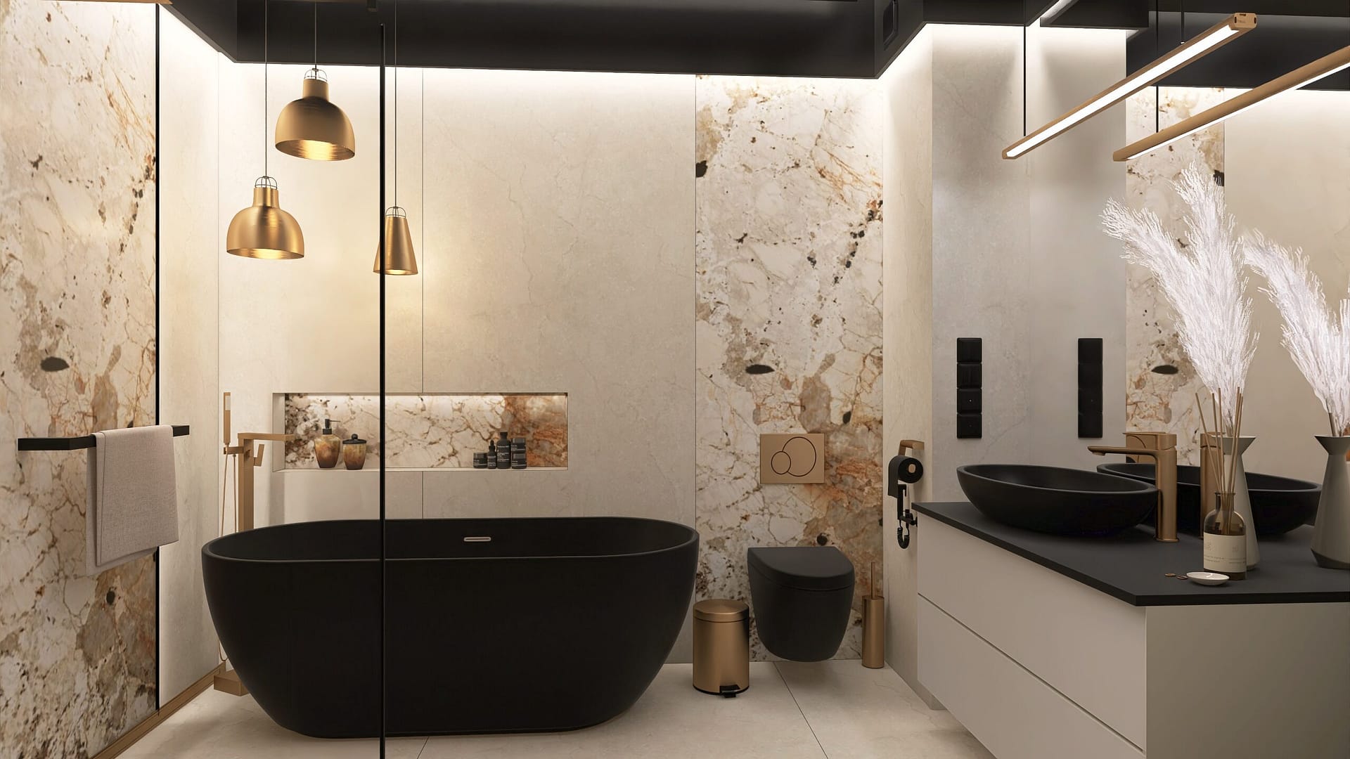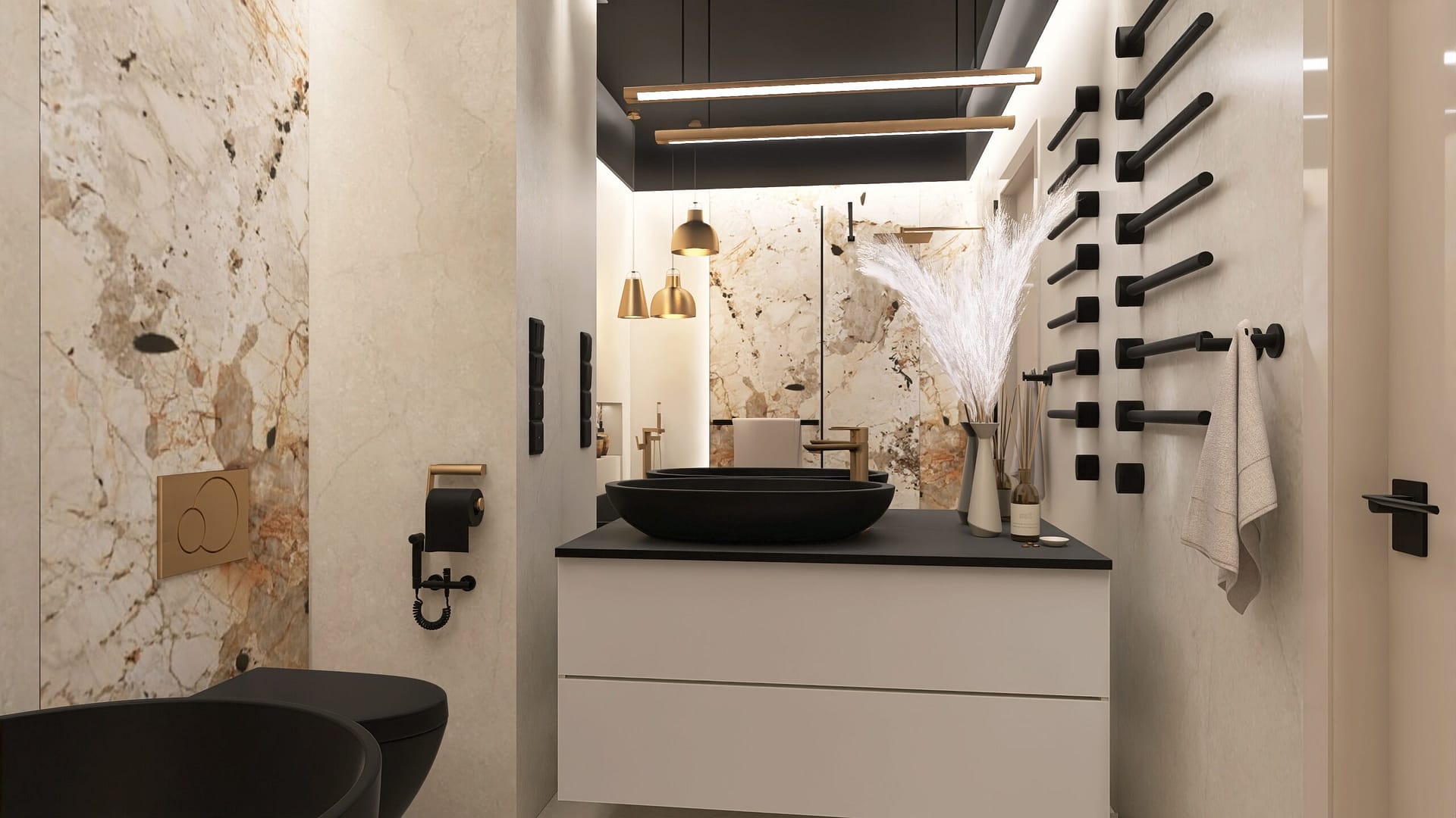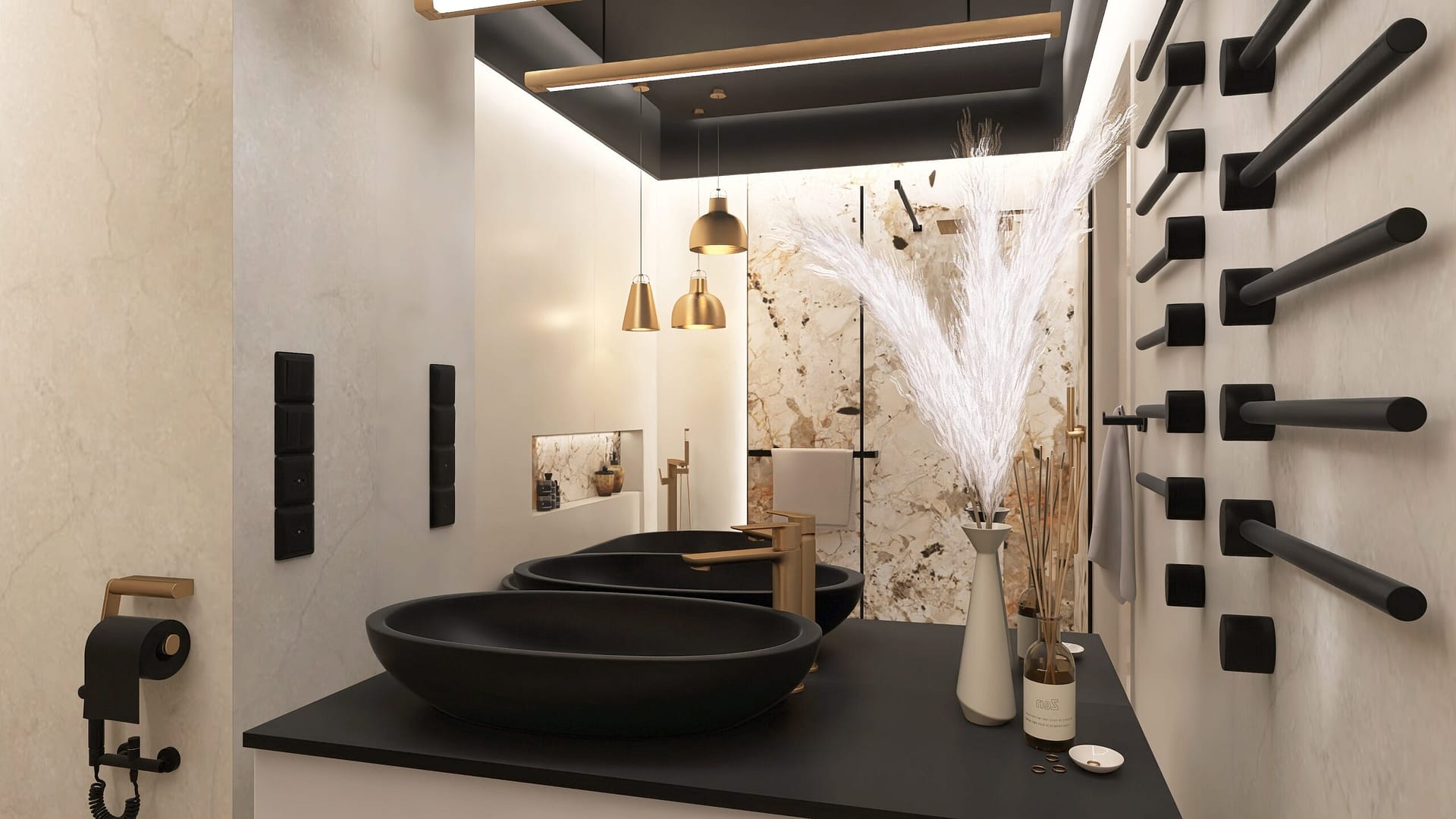 Łazienka o powierzchni 5,5m2 – niewielka, a w zaproponowanym układzie udało się zmieścić i wannę i prysznic. Prysznic typu Walk-in oraz wanna wolnostojąca w kolorze czarny mat. Z tej samej serii produktów zaproponowałam również nablatową umywalkę.