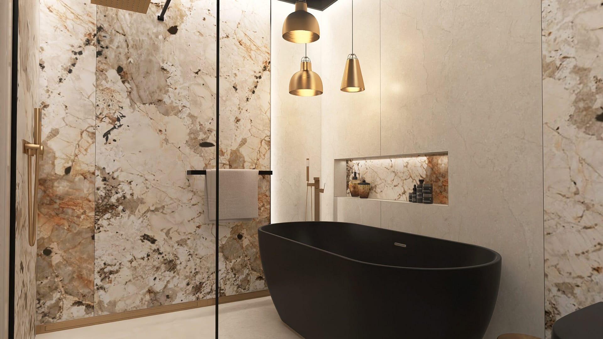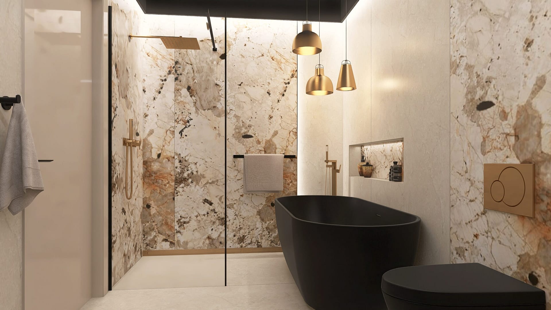 Projekt łazienki, której zdobienia oparte są na naturalnie występującym materiałach a dokładnie skale, której dominującym składnikiem jest kwarc. To właśnie on tworzy piękne wzoru w naszej łazience pod prysznicem, w przestrzeni za toaletą oraz wypełnienie półki nad wanną . Kwarcyt Patagonia Clasic przepięknie łączy się z spiekiem kwarcowym – Limestone Light. Naturalne materiały oraz naturalne kolory piaskowców – cudowne!